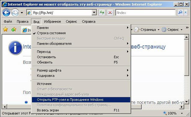 Теперь заходим Вид - Открыть Ftp-узел в Проводнике Windows.