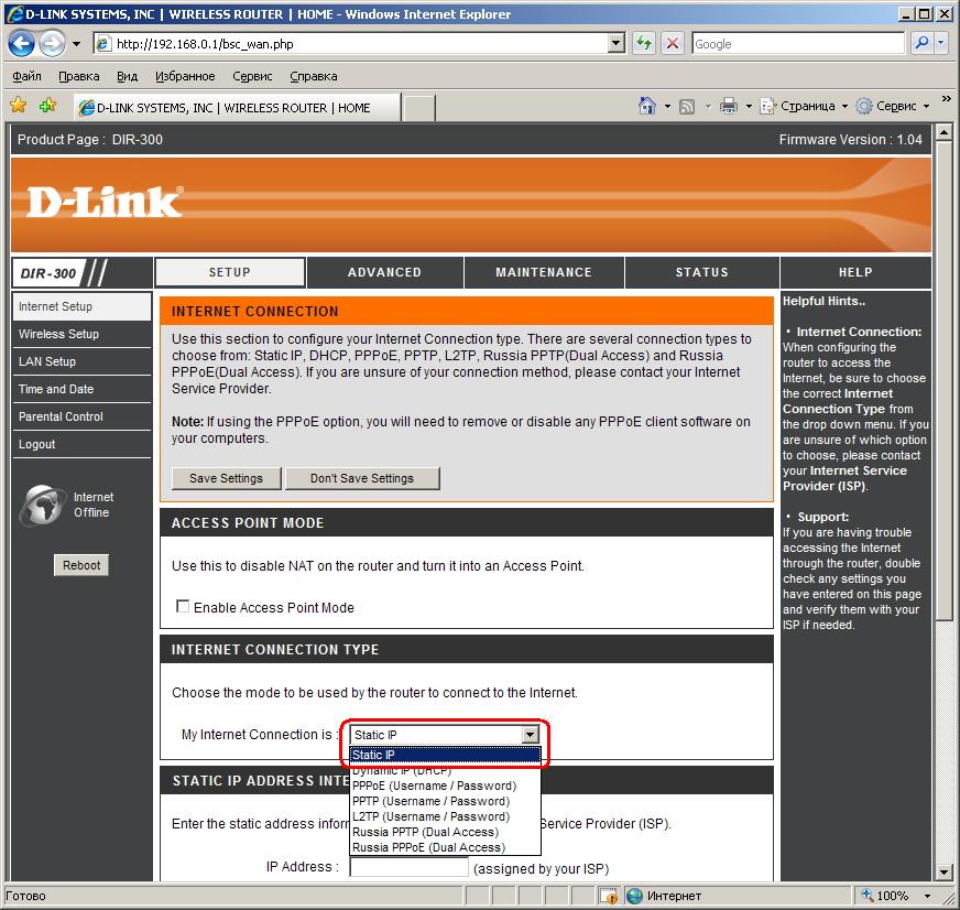 В подразделе Internet Connection Type выбираем левой кнопкой мыши Static IP.