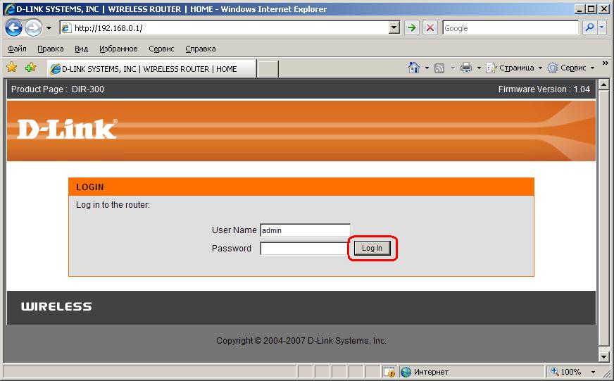 После этого необходимо ввести Имя пользователя (User Name) и Пароль (Password). По умолчанию в Интернет-маршрутизаторе D-Link Dir-300 в поле User Name вбиваем: admin. А поле Password оставляем пустым и нажимаем кнопку Login.