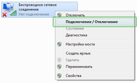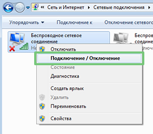 Нажмите правую кнопку мышки на иконке Беспроводное сетевое соединение и в открывшемся меню выберите Подключение/Отключение