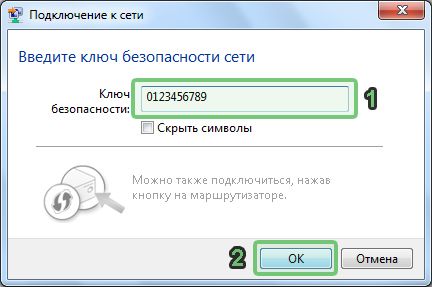 Через некоторое время появится окно с приглашением ввести ключ безопасности. Вводим, придуманный при настройке роутера ключ шифрования и нажимаем ОК. (см. скриншот) Также вместо ввода ключа шифрования можно нажать кнопку WPS на лицевой панели роутера.