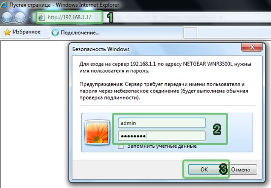 После этого в всплывающем окошке необходимо ввести имя Пользователя и Пароль. По умолчанию для интернет-маршрутизаторов NETGEAR в поле Пользователь необходимо ввести: admin и в поле Пароль: password (шаг2). Затем нажать OK (шаг 3).
