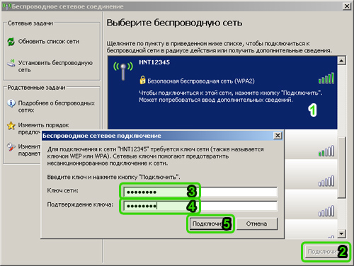 В открывшемся списке доступных беспроводных сетей выбираем нашу беспроводную сеть HNT12345 (шаг 1 на сриншоте) и нажимаем кнопкуПодключить (шаг 2). Откроется окно с приглашением ввести ключ шифрования. Вводим два раза ключ шифрования (шаг 3 и 4) и нажимаемПодключить (шаг 5).