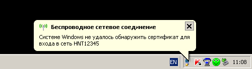 3. Если, при подключении, возникает ошибка о том что «Системе Windows не удалось обнаружить сертификат для входа в сеть HNT12345» (см. скриншот), то необходимо отключить проверку подлинности.