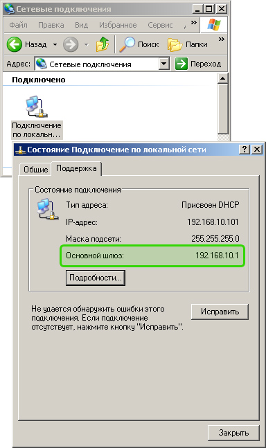 По умолчанию интернет-маршрутизатор имеет локальный IP-адрес 192.168.1.1 И поэтому Ваш компьютер получит IP-адрес (в нашем случае 192.168.1.2) из этой же подсети 192.168.1.0/24, а IP-адрес маршрутизатора (192.168.1.1) будет выдан Вашему компьютеру в качестве Шлюза по умолчанию. Закрываем окно Сведения о сетевом подключении и окно Состояние – Подключение по локальной сети.