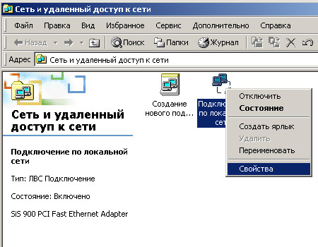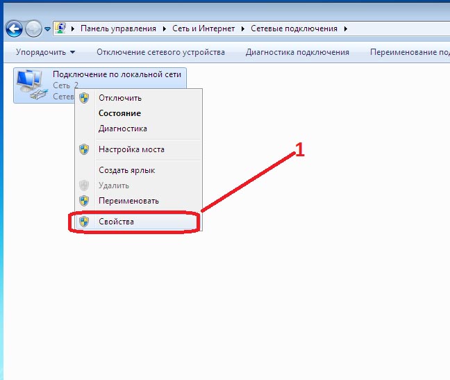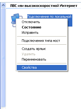 3. В открывшемся окне кликните на пункт "Подключение по локальной сети" правой кнопкой мыши и выберите пункт "Свойства".