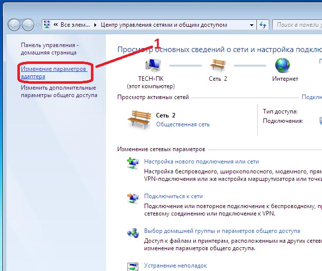 2. В появившемся окне кликните на пункт "Изменение параметров адаптера".