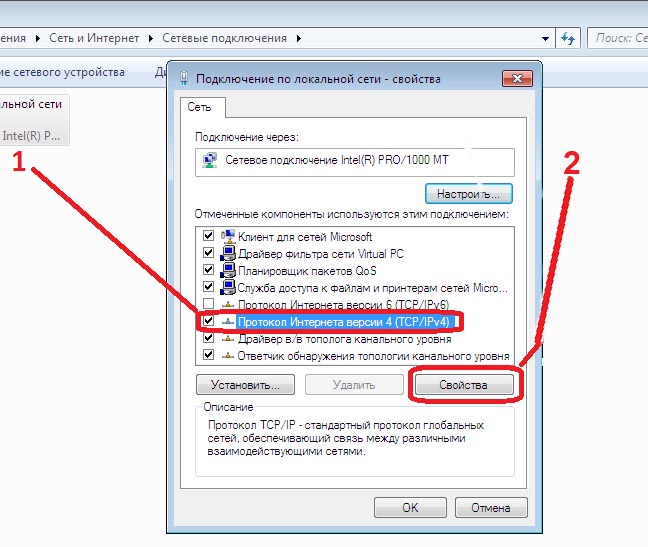 4. В свойствах "Подключения по локальной сети" отключите пункт "Протокол Интернета версии 6 (TCP/IPv6). Выберите мышкой TCP/IPv4 и кликните на кнопке "Свойства".