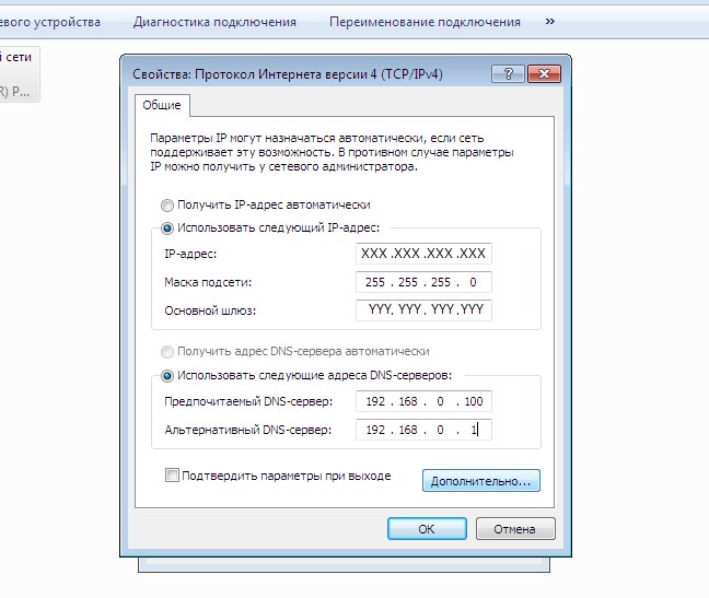 5. Появляется окно конфигурации протокола TCP/IPv4. Выбираете "Использовать следующий IP адрес " и вводите данные (IP адрес, маску подсети, основной шлюз), указанные в Вашей регистрационной карточке. Выбираете "Использовать следующие адреса DNS серверов" и вводите адреса серверов DNS, указанных в регистрационной карточке. TCP/IPv4 настроен. Теперь Вы нажимаете кнопку OK, затем кнопку "Закрыть".