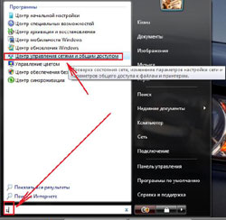 1. Нажмите кнопку "Пуск", введите в строке поиска начальные буквы слова Центр. Из списка выберите пункт "Центр управления сетями и общим доступом".