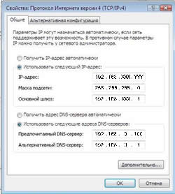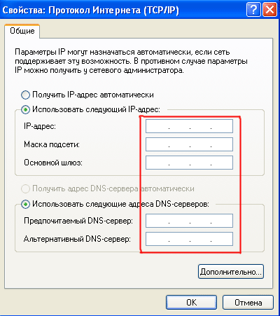 Здесь ставите точку на «Использовать следующий TCP/IP адрес» и вбиваете данные с Вашей регистрационной карточки(IP-адрес, Маска подсети, Основной шлюз, Предпочитаемый DNS сервер и Альтернативный DNS сервер).