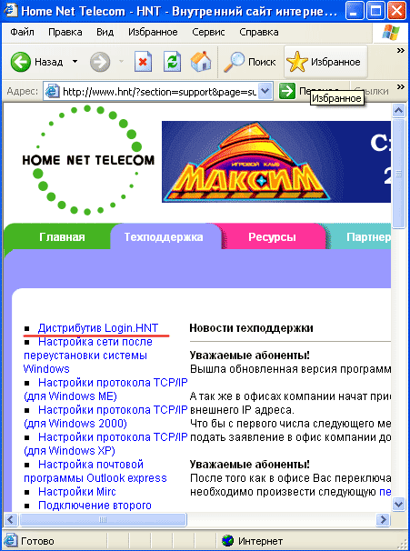 После этого открываем браузер (значок "е") и в адресной строке набираем(www.hnt). И попадаем на страницу HNT. В разделе техподдержка в левом меню кликнем на ссылку Дистрибутив Login.HNT.