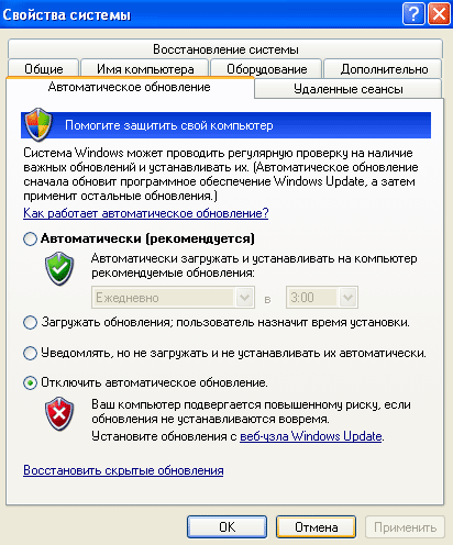 И переставляем точку с "Выполнять автоматическое обновление..." на «Отключить автоматическое обновление» . При этом все текстовые поля становятся неактивными.